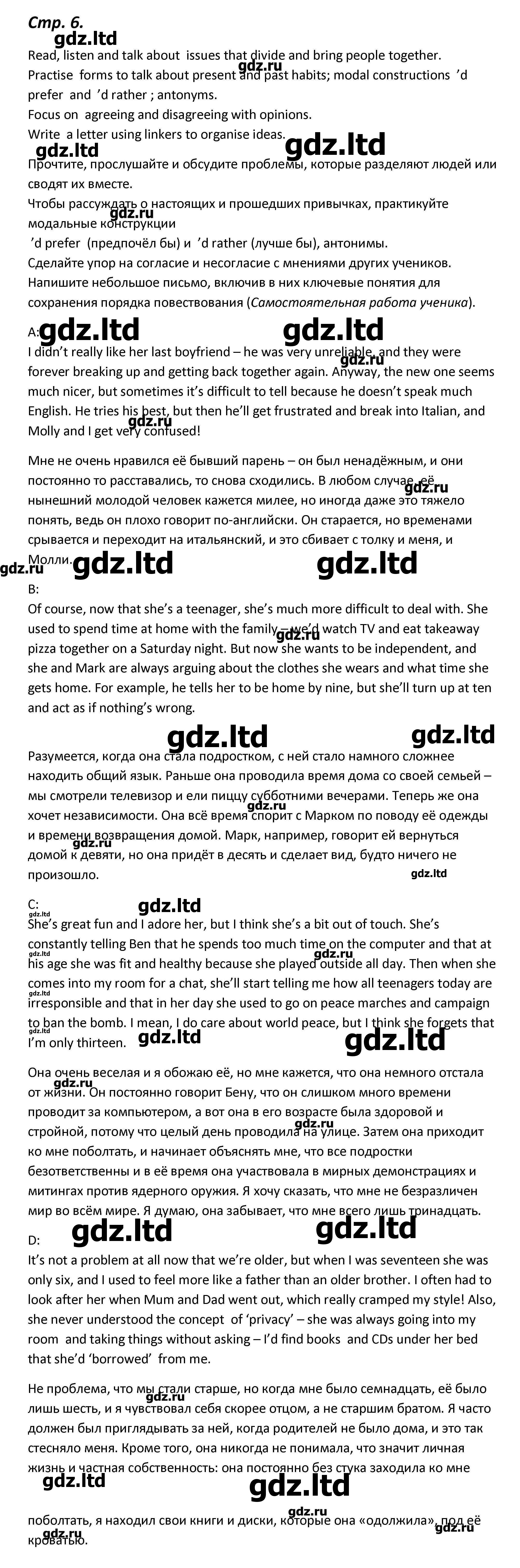 Старшеклассники по-разному подходят к учебе. Кто-то из них ответственно просиживает над учебниками и старательно запоминает необходимую тематику. А некоторые предпочитают побыстрее отделаться от д/з и весело провести время с друзьями. Но подобное поведение может поставить под удар успеваемость этих ребят, так как они походя относятся к получаемой информации, не давая себе труда ее запомнить. Не стоит все же забывать о том, что решебник к учебнику серии Forward "Английский язык 11 класс" Вербицкая, Каминс Карр, Парсонс будет полезен только в том случае, если использовать его по назначению, а не применять для простого списывания.